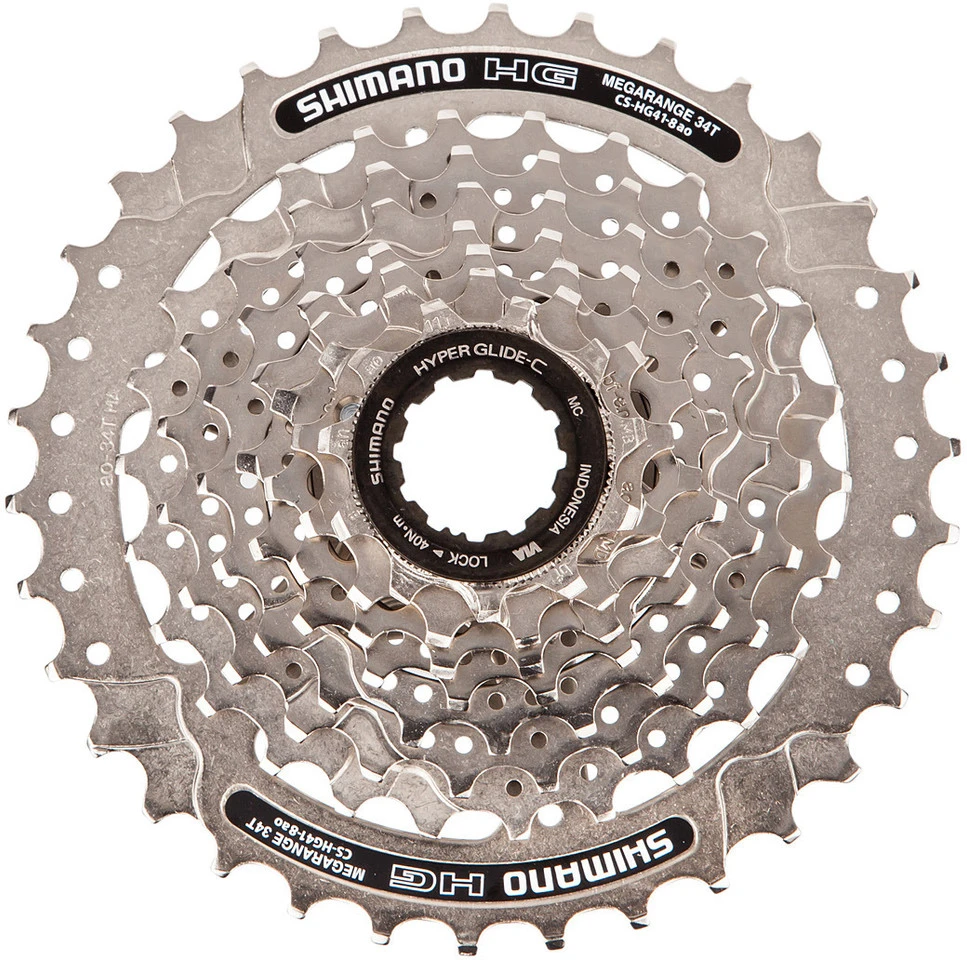 Abstufung:11-13-15-17-20-23-26-34 ZHerstellernummer:E-CSHG418134Lieferumfang:1 x Kassette Shimano CS-HG41 8-fach1 x Abschlussring Shimano Stahl